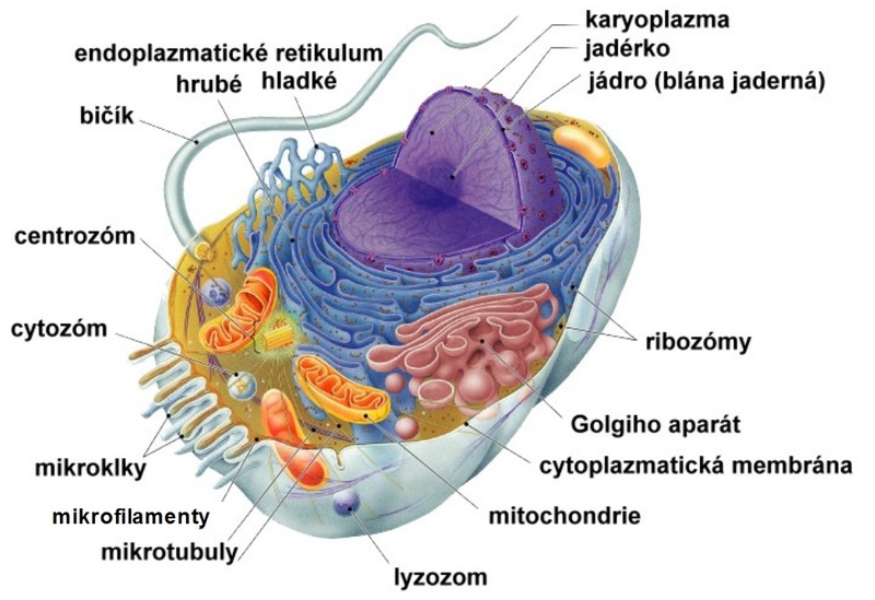 Obrázek eukaryotické živočišné buňky s popisem.