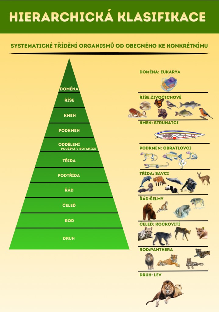 Infografika o hierarchické klasifikaci k článku Tři domény života na Zemi, vědecké názvosloví, hierarchická klasifikace.