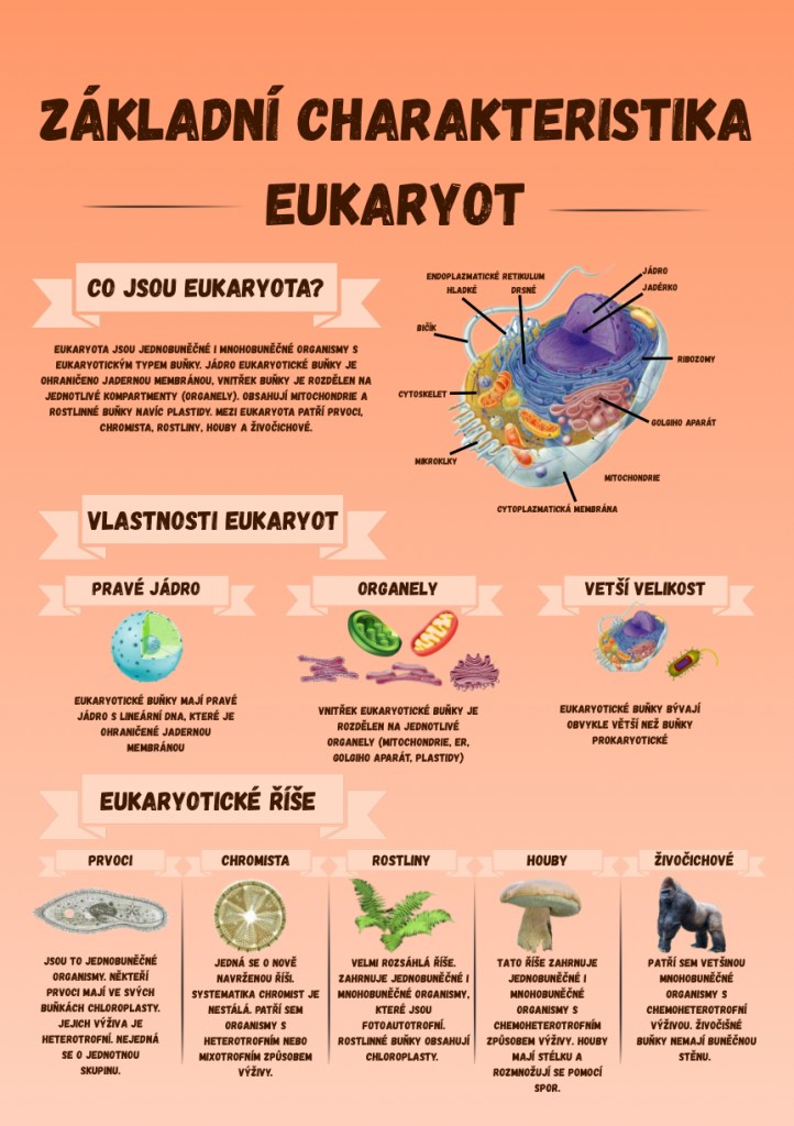 Infografika s jednoduchým popiskem základní charakteristiky eukaryot, vytvořená podle článku Základní charakteristika eukaryot.