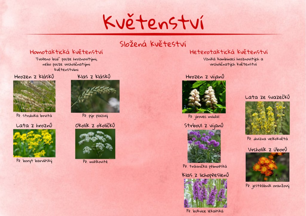 Infografiky k článku Rostlinné orgány – květ II. zaměřené konkrétně na jednoduchá a složená květenství.